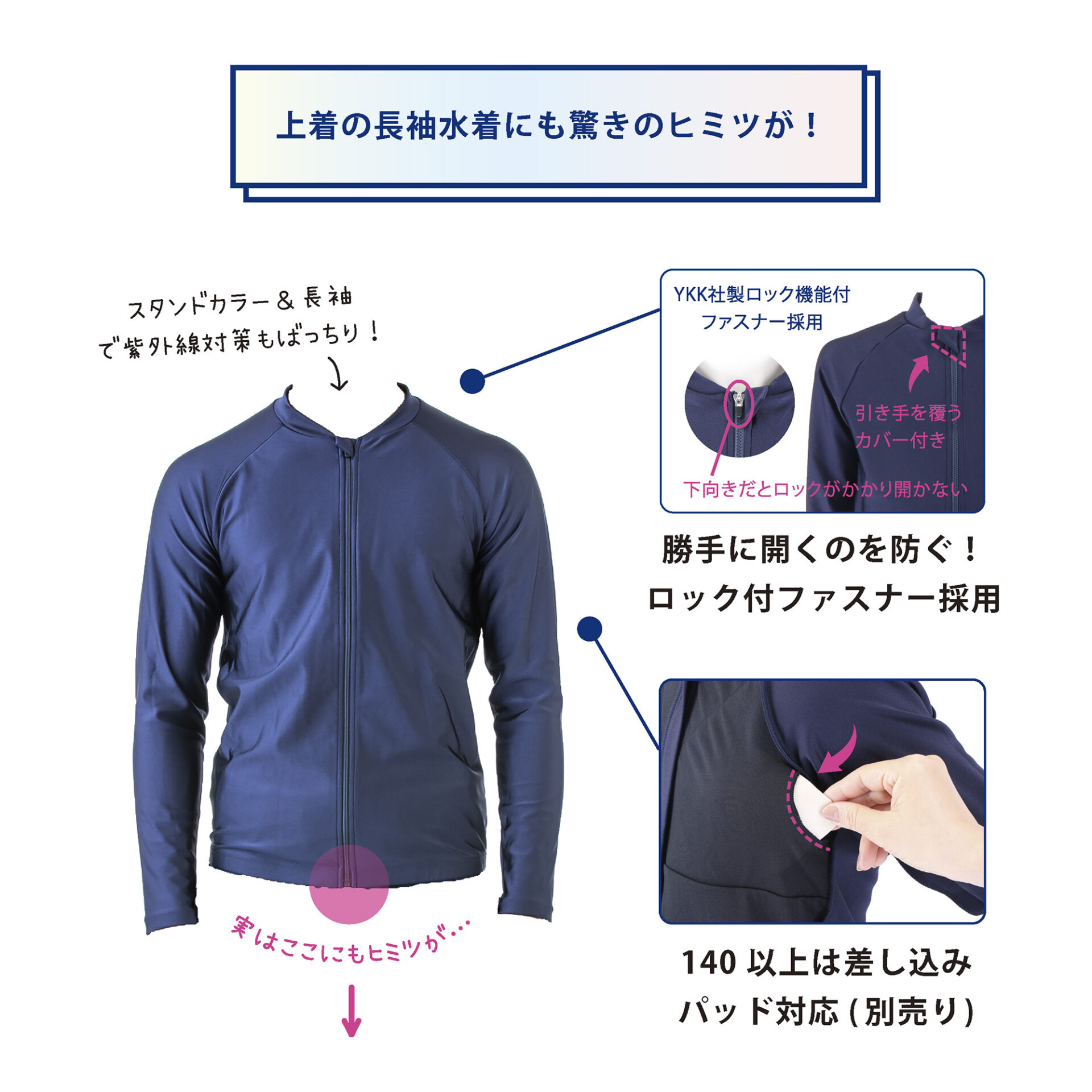 上着は一枚で着て泳げます。またロック機能式のファスナーと引き手部分にはガードを付け、不意に開かない工夫をしています。